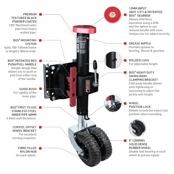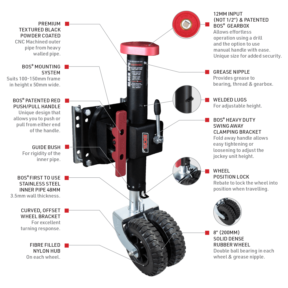 This swing away unit features a powerful gearbox for effortless lifting, even under load. Built with durable stainless steel and CNC-machined outer housing, it’s designed for precision, strength, and easy operation on single-axle trailers.