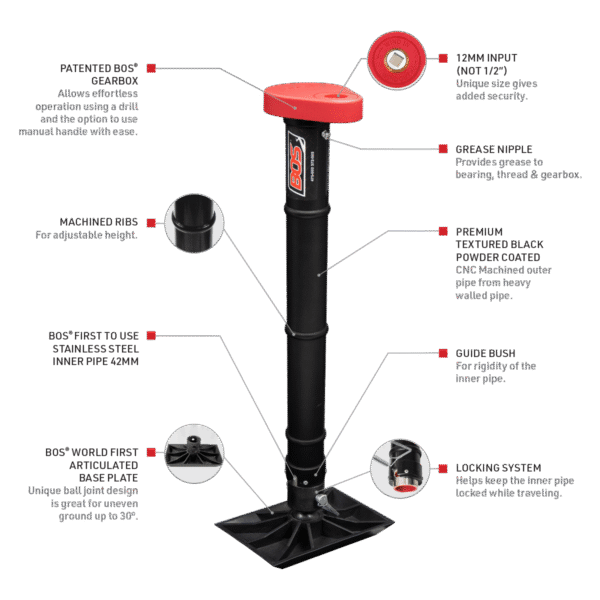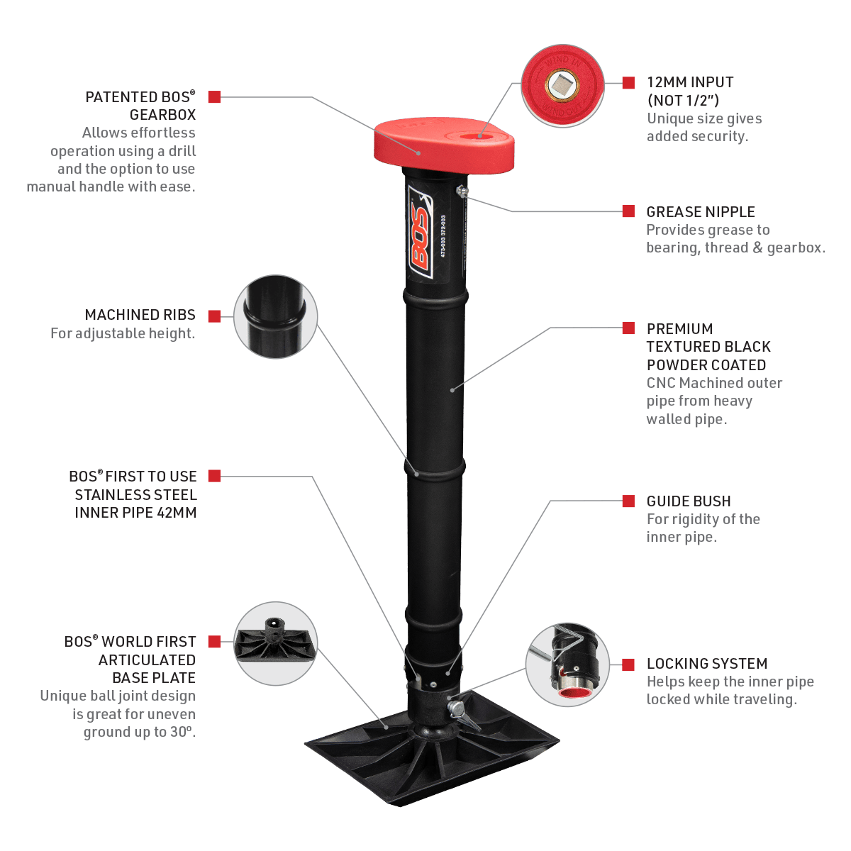 Compact gearbox jockey unit with 3-rib height adjustment, articulated base plate, and drill or manual operation.