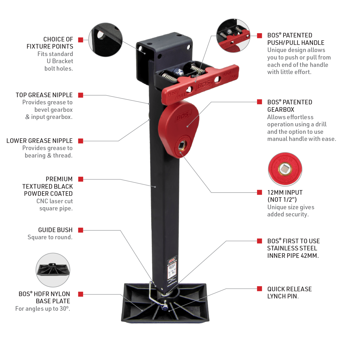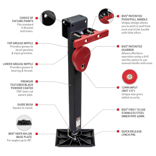 Heavy-duty stabiliser legs for caravan leveling and tyre changes, with drill or manual operation.